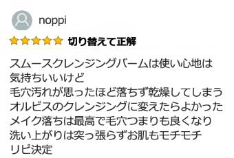 「はじめはスムースクレンジングバームを使っていたけどオルビスに切り替えた」という口コミもいくつかありました。