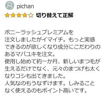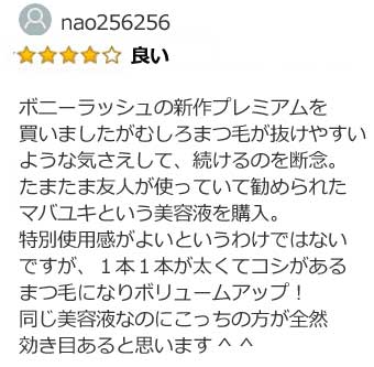「はじめはボニーラッシュプレミアムを使ったけど、マバユキに切り替えた」という口コミもいくつかありました。